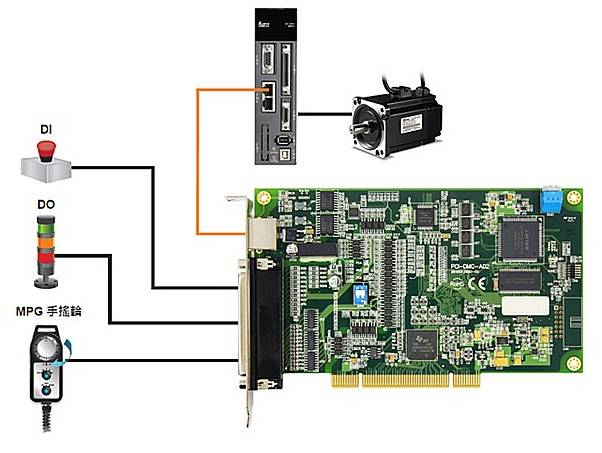 The Delta PCI-DMC-A02 motion control axis card features 32 digital input points and 24 digital output points directly on the axis card, providing a fast-response local I/O interface without requiring remote module communication.