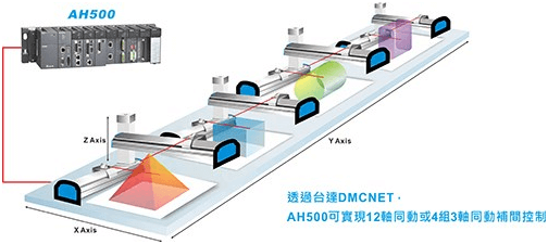 The system applies the excellent motion control function of AH500 to realize any three-axis linear interpolation, any two-axis arc interpolation, and any three-axis spiral interpolation and continuous interpolation functions. Through Delta’s DMCNET high-speed communication network architecture, it can achieve 12-axis simultaneous motion or 4 groups of 3-axis simultaneous motion tweening functions within a 1ms command cycle. Whether it is complex process control or precise motion control requirements, it can be realized through AH500, which is effectively used in various industrial machines, such as building materials machines, warp knitting machines, food packaging machines, etc.